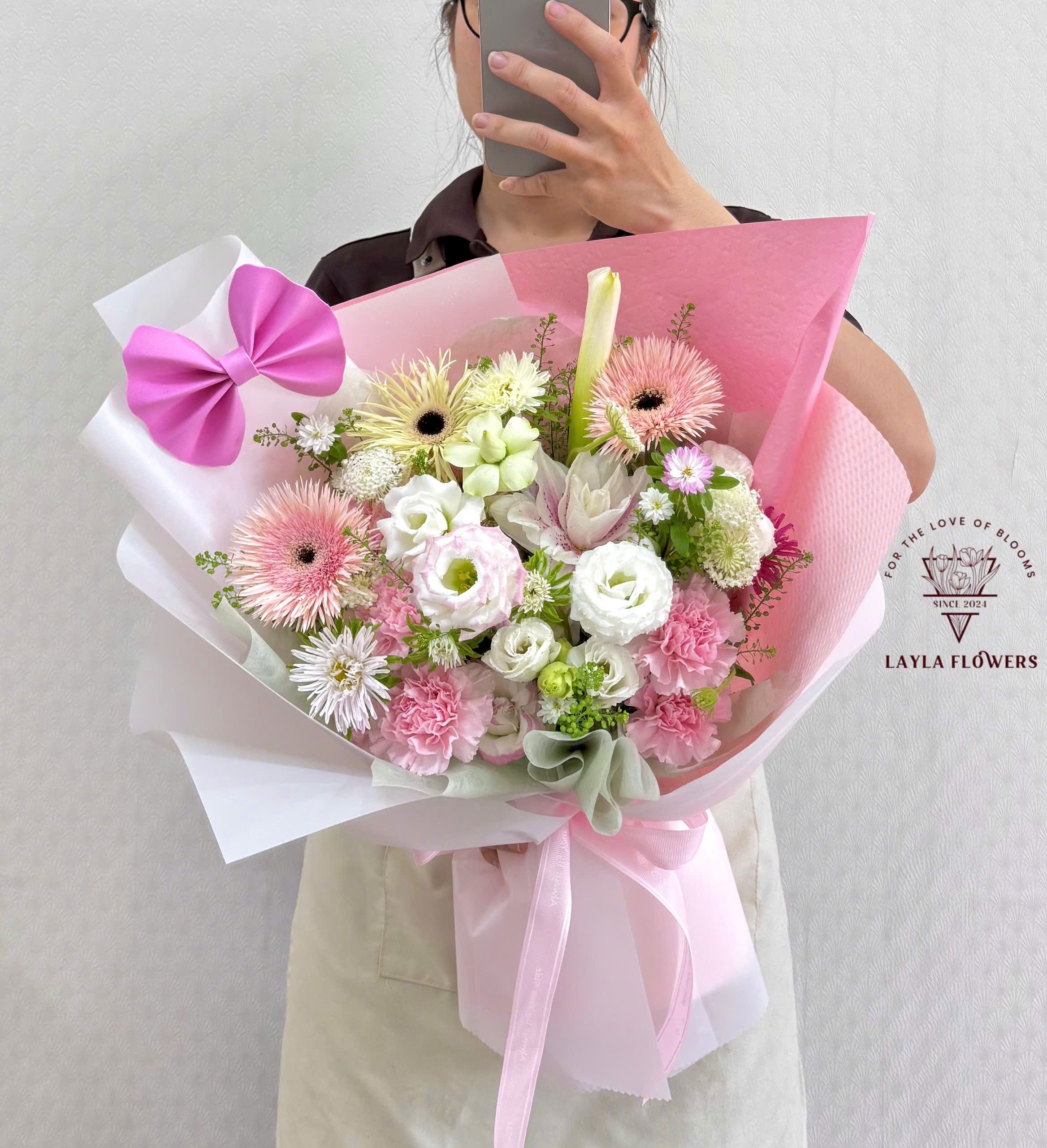 Kết hợp loại hoa theo từng thời điểm, tùy mặt hàng hoa có sẵn ở tiệm tone chủ đạo trắng hồng.