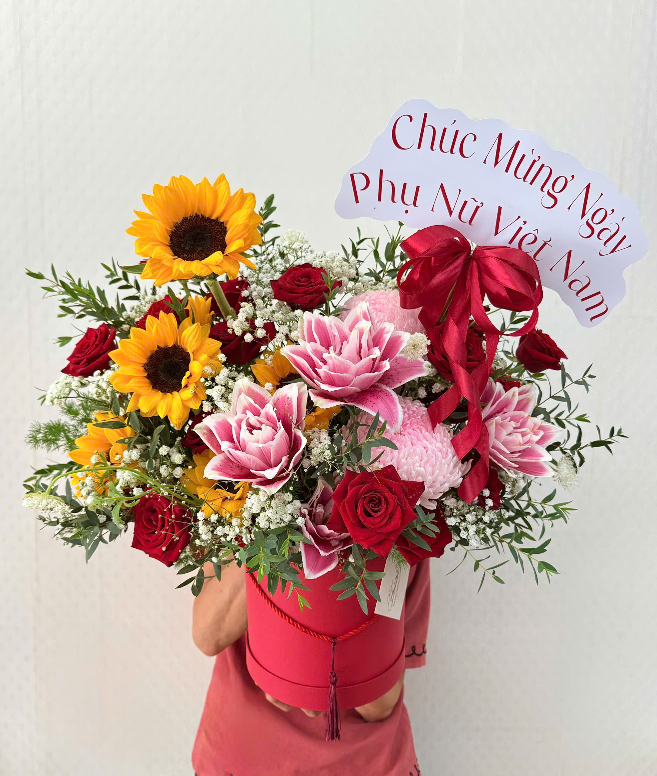 Hộp hoa là một lời tri ân, tôn vinh vẻ đẹp, sự hy sinh và vai trò quan trọng của người phụ nữ trong gia đình cũng như xã hội. Màu sắc rực rỡ tượng trưng cho niềm vui, sự tươi trẻ và lòng biết ơn sâu sắc.