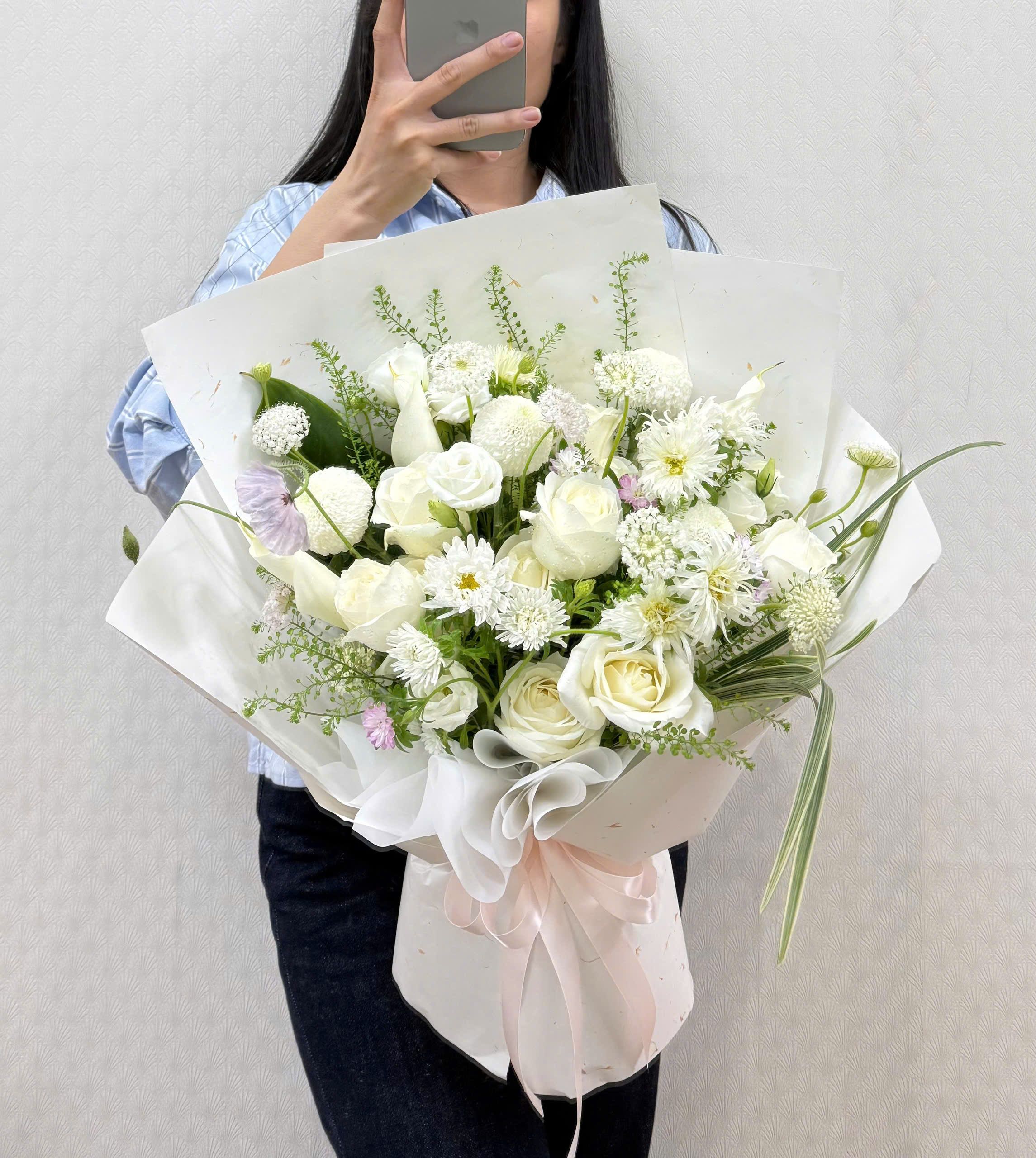 Bó hoa mang lại cảm giác tươi mới, tinh tế và sang trọng, giống như một khoảnh khắc được chụp để lưu giữ sự giản dị mà đẹp đẽ trong đời thường — có thể là dịp đặc biệt như sinh nhật, lễ tốt nghiệp, hay chỉ đơn giản là một ngày muốn dành cho hoa. 🌿💐