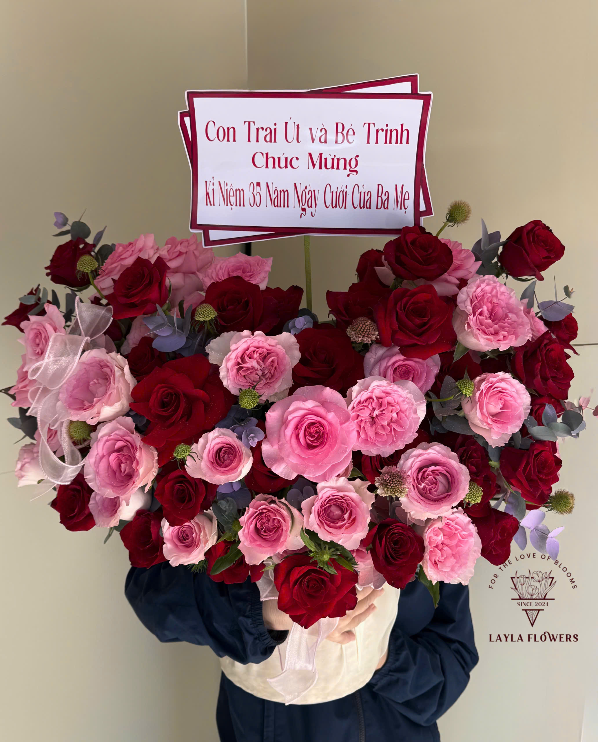 Giỏ hoa có thiết kế sang trọng và ấm áp, phù hợp cho dịp kỷ niệm ngày cưới.