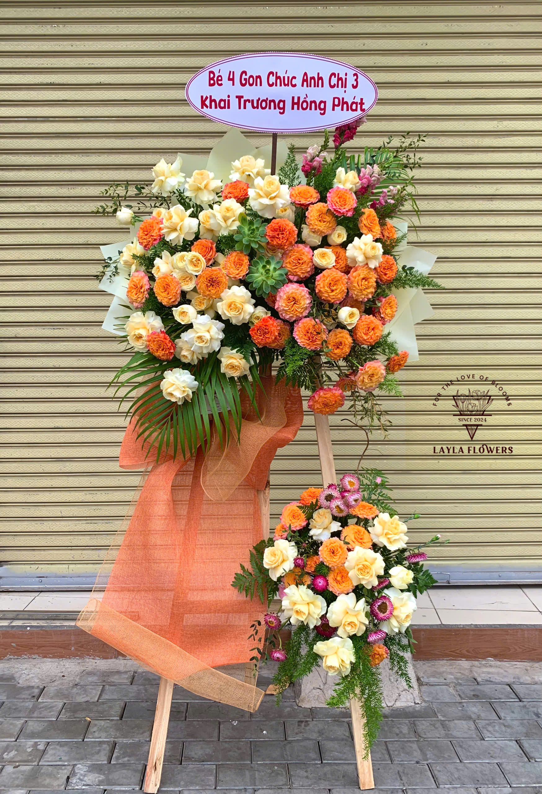 Loại hoa chính: Cam Spirit, Vàng victory, và 1 số hoa lá phụ