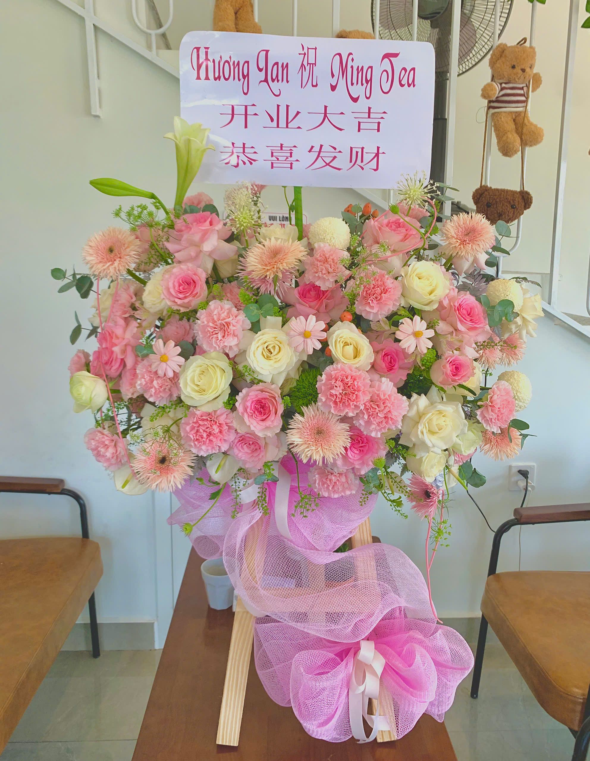 Loại hoa chính: Hoa hồng lạc thần, đồng tiền tua hồng, hoa hồng màu trắng, cẩm chướng đơn và 1 số hoa lá phụ.
